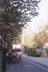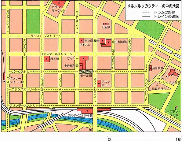 学校から、トラムで45分、車では20分のところに、ビクトリア州第1の都市メルボルンの中心がい(シティー)があります。ここは、グレンアイラ市とはちがって、道路がたて、横にあみ目のようにはしり、バス、トラムの路線もここに集まってきています。また、トレインもシティーを走っていて、交通のべんがとてもよく、買い物にべんりになっています。