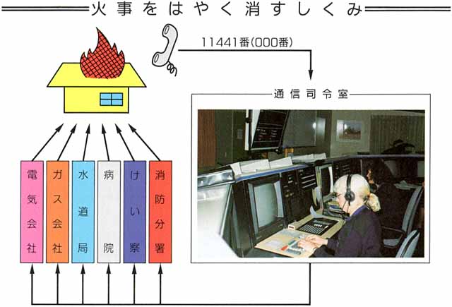 火事がおきたとき大きな火事にしないためには、早く火事をみつけて、早く火事のげん場へ行き、早く火を消すことです。そのためには、火事がおきたことをできるだけ早く消防署の人に連絡しなければなりません。 火事が起きたら、11441番(000番)で消防署へ知らせます。電話は消防本部の通信司令室につながります。通信司令室では多くの人が交替で昼も夜も働いています。メルボルンの道路はすべてコンピュータがおぼえていて、火事がおきた場所から一番近い消防分署をコンピュータがみつけすぐ連絡できるようになっています。消防分署では知らせを聞くと、すぐ消防車でかけつけます。消防車はサイレンをならしながら火事げん場まで行きます。一ぱんの車はサイレンを聞くと道をあけなければなりません。交差点では信号が青でも止まり、消防車ができるだけ早く火事げん場へ行けるように協力します。連絡があってから7分くらいまでには火事のげん場へ行けるそうです。通信司令室では火事のようすによって、さらにまわりの消防分署に応援をたのみます。けい察、ガス会社、電気会社に連絡をとり、火事を消す応援をします。 火事でけがをした人のために病院にも連絡をとります。これらの連絡もすぐできるようになっています。 通信司令室への電話は1988〜89年の1年間に38752回もありました。しかし、まちがい電話や火事に関係ない電話が